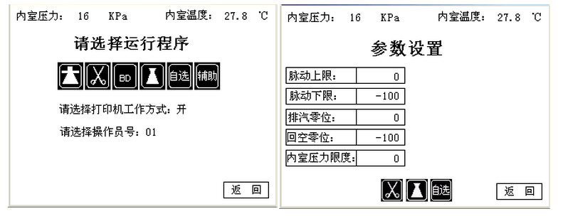 菌過程的溫度、壓力、時間、過程階段、預置參數等均在觸摸屏顯示器中自動顯示并可以隨時儲存,并配有微型打印機進行打印工作過程參數以便于歸檔、備查。此外,該控制系統配備有一套完整的自測及校正程序,可以實現不同海拔高度下、不同地區的壓力、溫度等參數的校正;還具有多級控制保護、幫助功能。