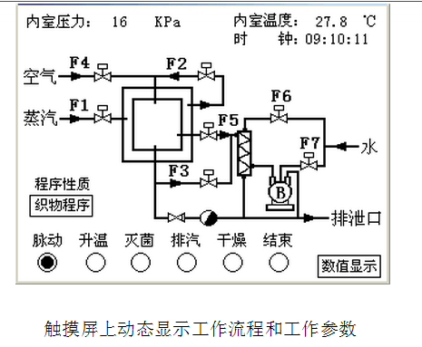 其它元件組成一套完整的控制系統,一般共配備了五套滅菌程序(織物程序﹑器械程序﹑液體程序﹑BD實驗、自選程序),您可以根據需要選擇應用,也可以根據實際情況改變工作參數。觸摸屏可實時顯示程序運行的每一過程狀態。