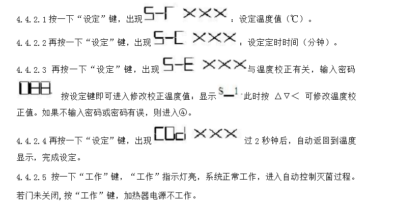 4.4.1開啟電源開關接通電源,數顯控制儀顯示。此時可開始設定溫度和滅菌時間。 4.4.2設定方法: