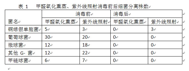4.3紫外線照射消毒法  在各醫院較廣泛地應用其殺菌原理是紫外線光使微生物的 DNA 產生誘變和致死。但紫外線照射強度及消毒效果受多種因素影響 ,從表 1 兩種消毒效果比較可知甲醛氧化熏蒸消毒優于紫外線照射消毒法。甲醛氧化熏蒸消毒效果顯著 ,取材方便、制作簡單 ,置入箱內消毒不受其他條件影響。此方法在基層醫院更具有實用性。